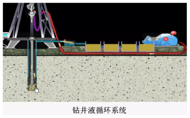鉆井泵將泥漿從泥漿罐中吸入,經(jīng)鉆井泵加壓后的泥漿,經(jīng)過高壓管匯、立管、水龍帶,進(jìn)入水龍頭,通過空心的鉆具下到井底,從鉆頭的水眼噴出,經(jīng)井眼和鉆具之間的環(huán)行空間攜帶巖屑返回地面,從井底返回的泥漿經(jīng)各級泥漿凈化設(shè)備,除去固相含量,然后重復(fù)使用。