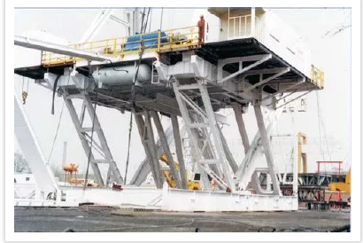 井架和底座用來支撐和安裝各鉆井設(shè)備和工具、提供鉆井操作場所。井架用來安裝天車、懸掛游車、大鉤、水龍頭和鉆具,承受鉆井工作載荷,排放立根;底座用來安裝動力機組、絞車、轉(zhuǎn)盤、支撐井架,借助轉(zhuǎn)盤懸持鉆具,提供轉(zhuǎn)盤和地面之間的高度空間,以安裝必要的防噴器和便于泥漿循環(huán)。